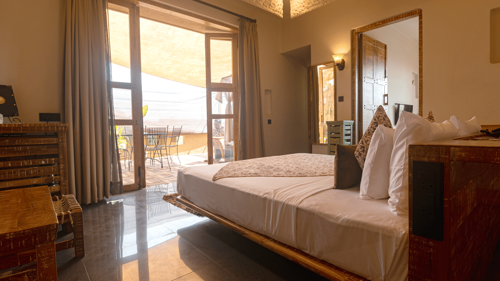 Earthy tones of rooms blend with stone paving in attached garden. Distressed finish furniture,traditional interiors add period touch. JuniorSuite: 415 sqft, two-seater Jacuzzi,queen-size bed,10"mattress,mini bar,flat-screen TV. Superior rooms highlight:private sit-out amidst greenery.