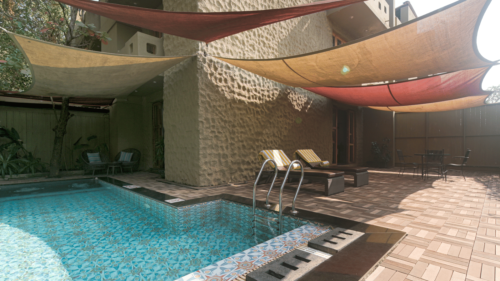 Earthy tones of rooms blend with stone paving in attached garden. Distressed finish furniture, traditional interiors add period touch. Junior Suite: 415sqft, two-seater Jacuzzi, queen-size bed, 10" mattress, mini bar, flat-screen TV. Superior rooms highlight: private sit-out amidst greenery.